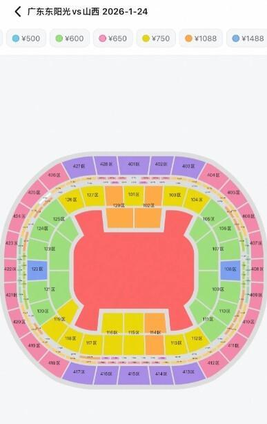 有媒体截图发布广东队主场的票价情况,主场对阵山西队,我们看到区间为500、600、650、750、1088、1488、1688、1888,达到8种价格。
